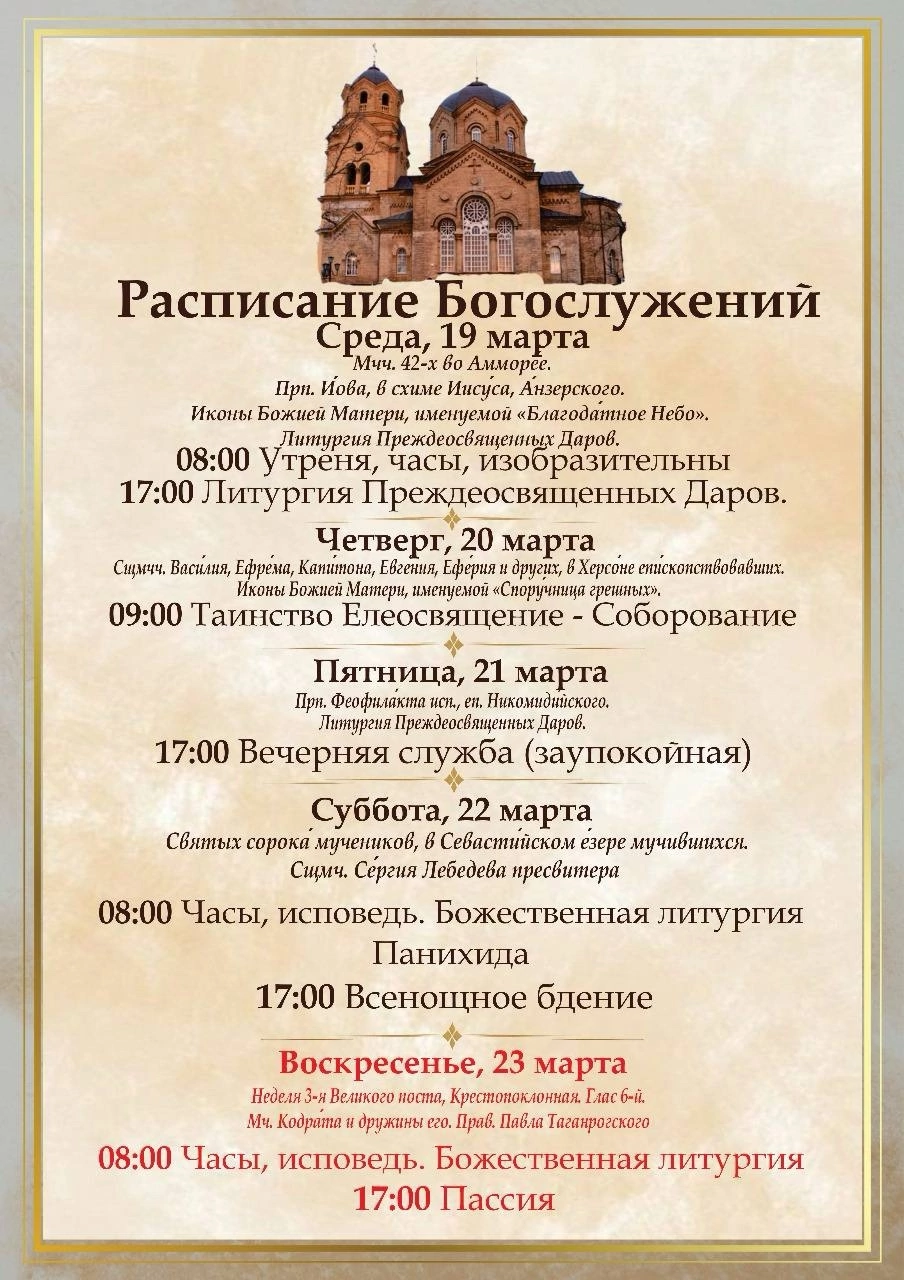 Расписание богослужений с 17 по 23 марта 17 марта 2025 1 | 2 Здесь вы найдете расписание богослужений с 17 по 23 марта в формате JPG. Можно скачать и распечатать. Формат JPG: с 17 по 23 марта 2025 в JPG